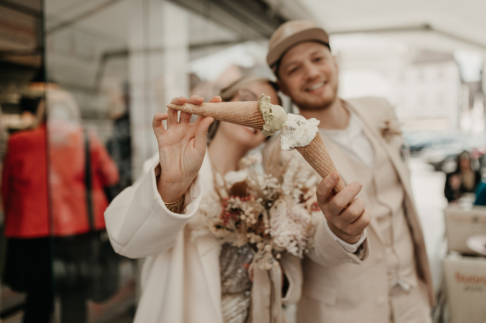 Gemütlich daheim im gleichen Haus fertig machen , entspannt zu Fuß zum Standesamt laufen, Trauung im engsten Kreis, danach erstmal ein Pistazien Eis in der Stadt & ein Kaffee to go und Abends eine große Party in der Lieblings Bar mit indisch Street Food, viel tanzen und den Liebsten. So ein authentischer, magischer und einmaliger Tag !